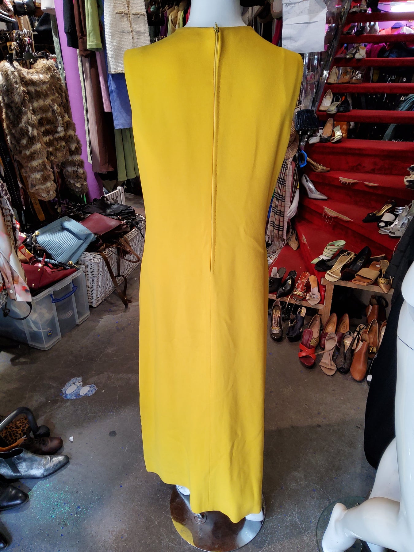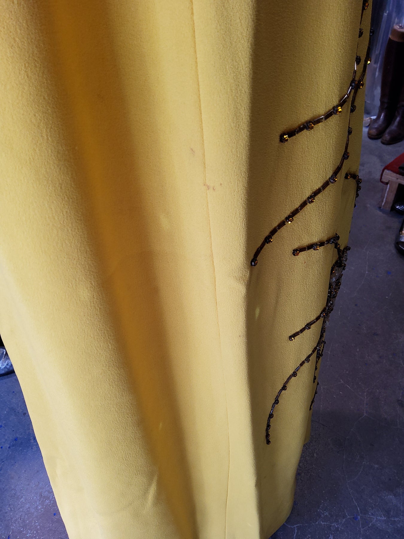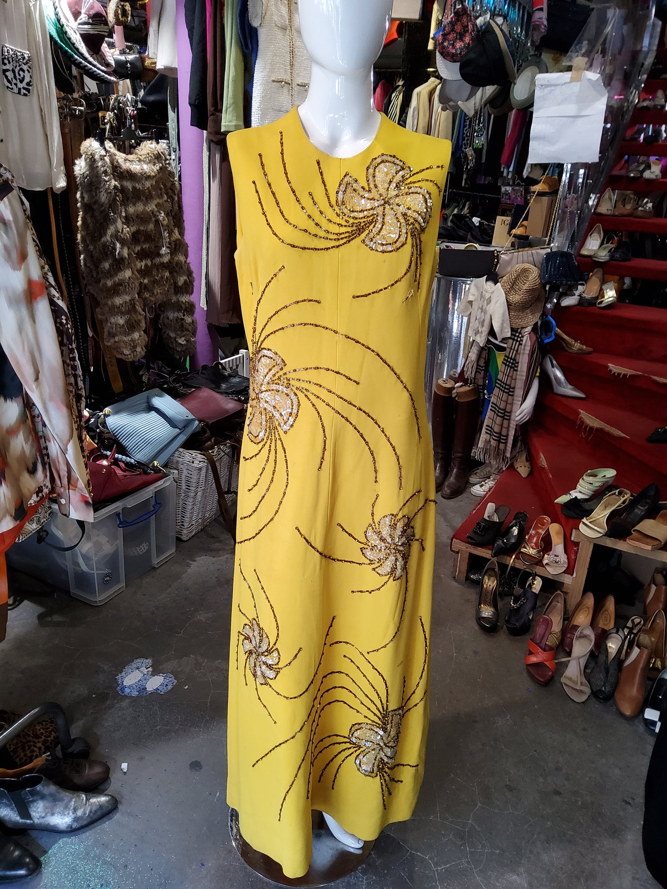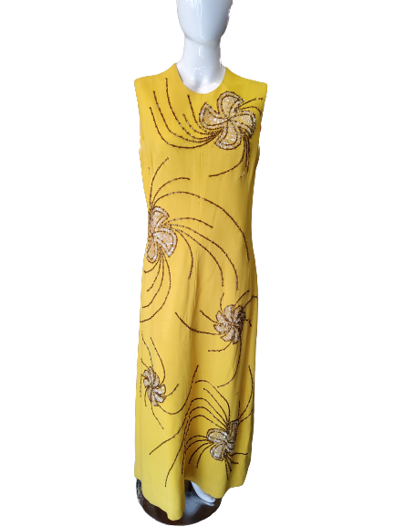 Robe longue Vintage à paillette sans manches couleur jaune en laine. Un peu des taches sur robe.