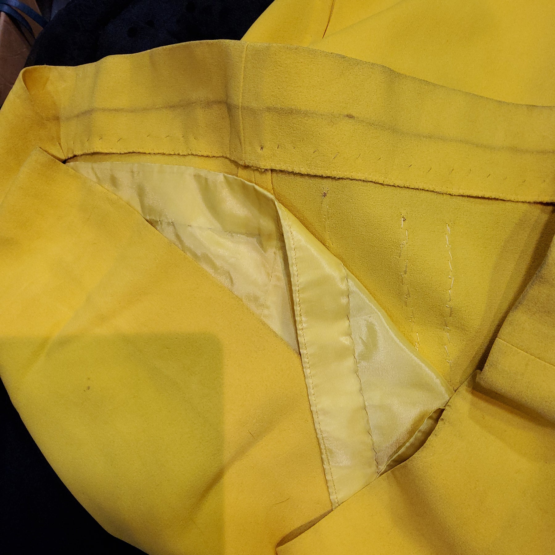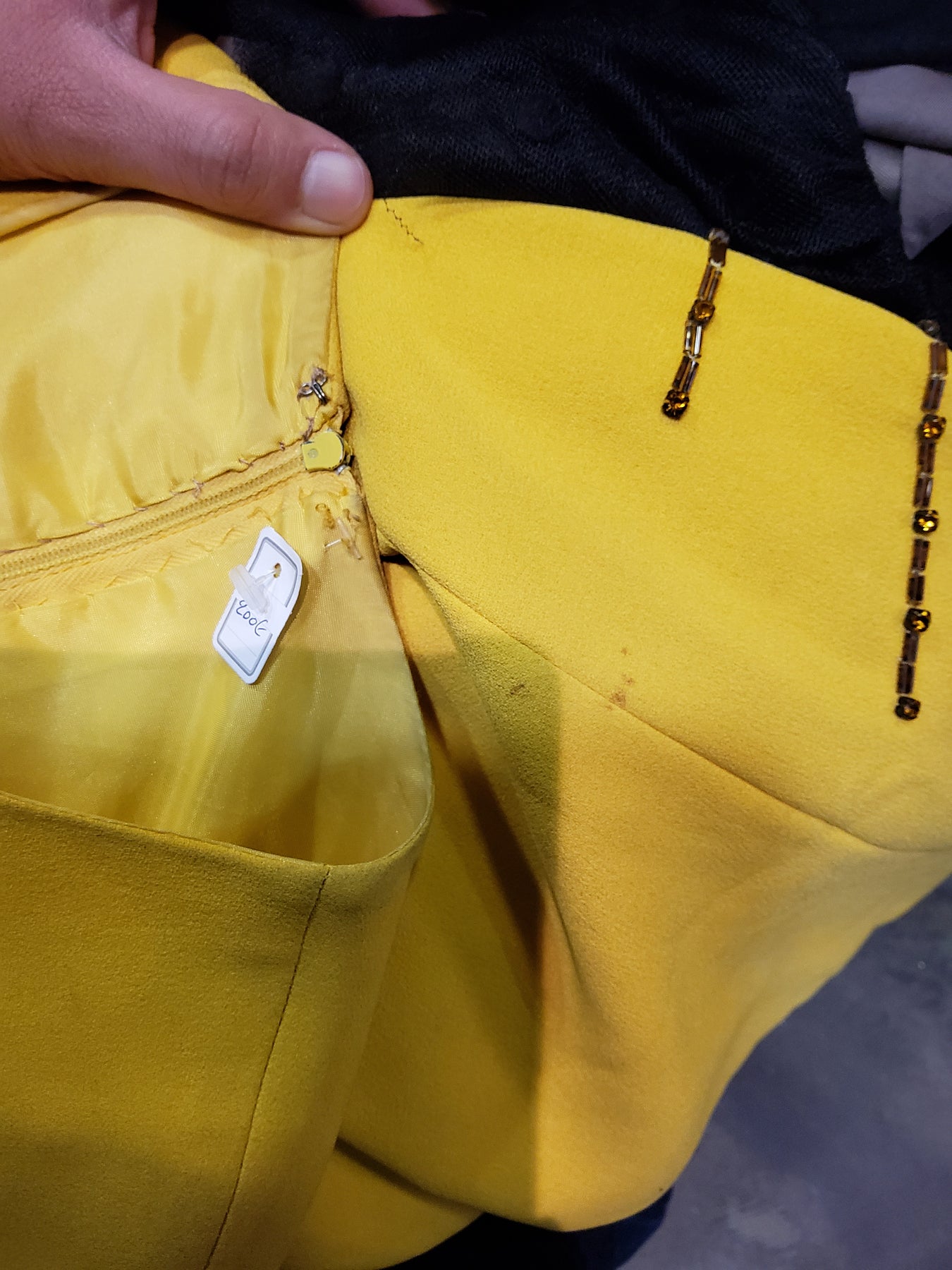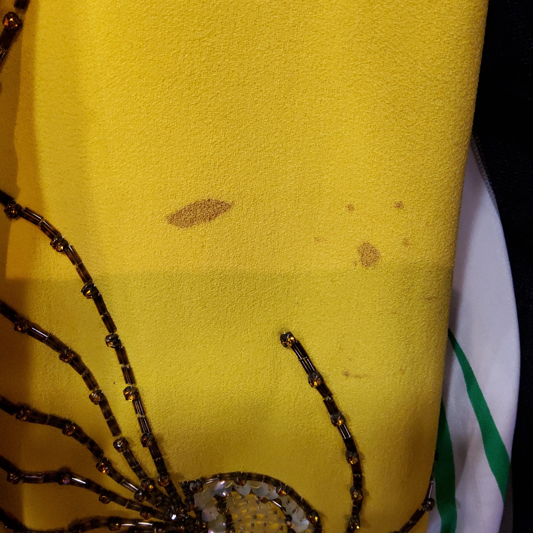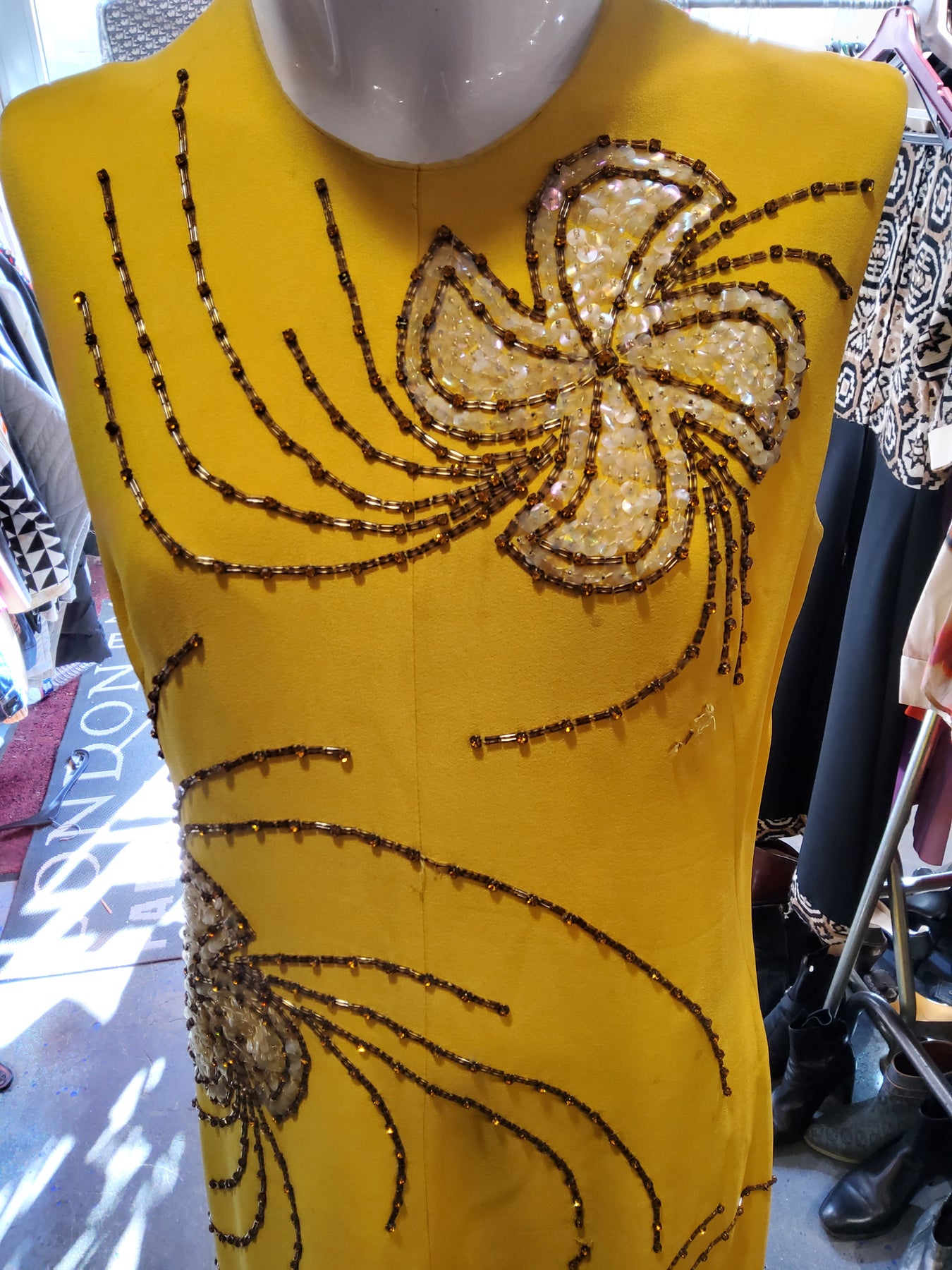 Robe longue Vintage à paillette sans manches couleur jaune en laine. Un peu des taches sur robe.